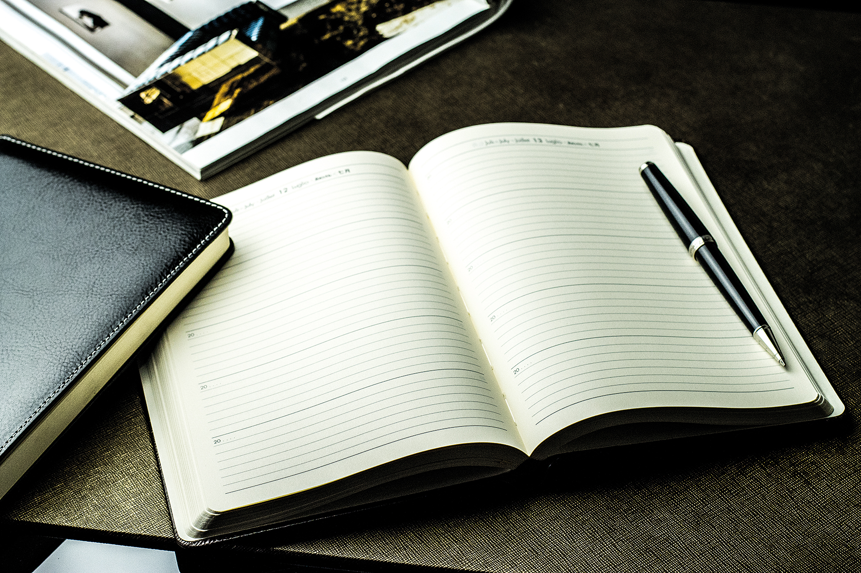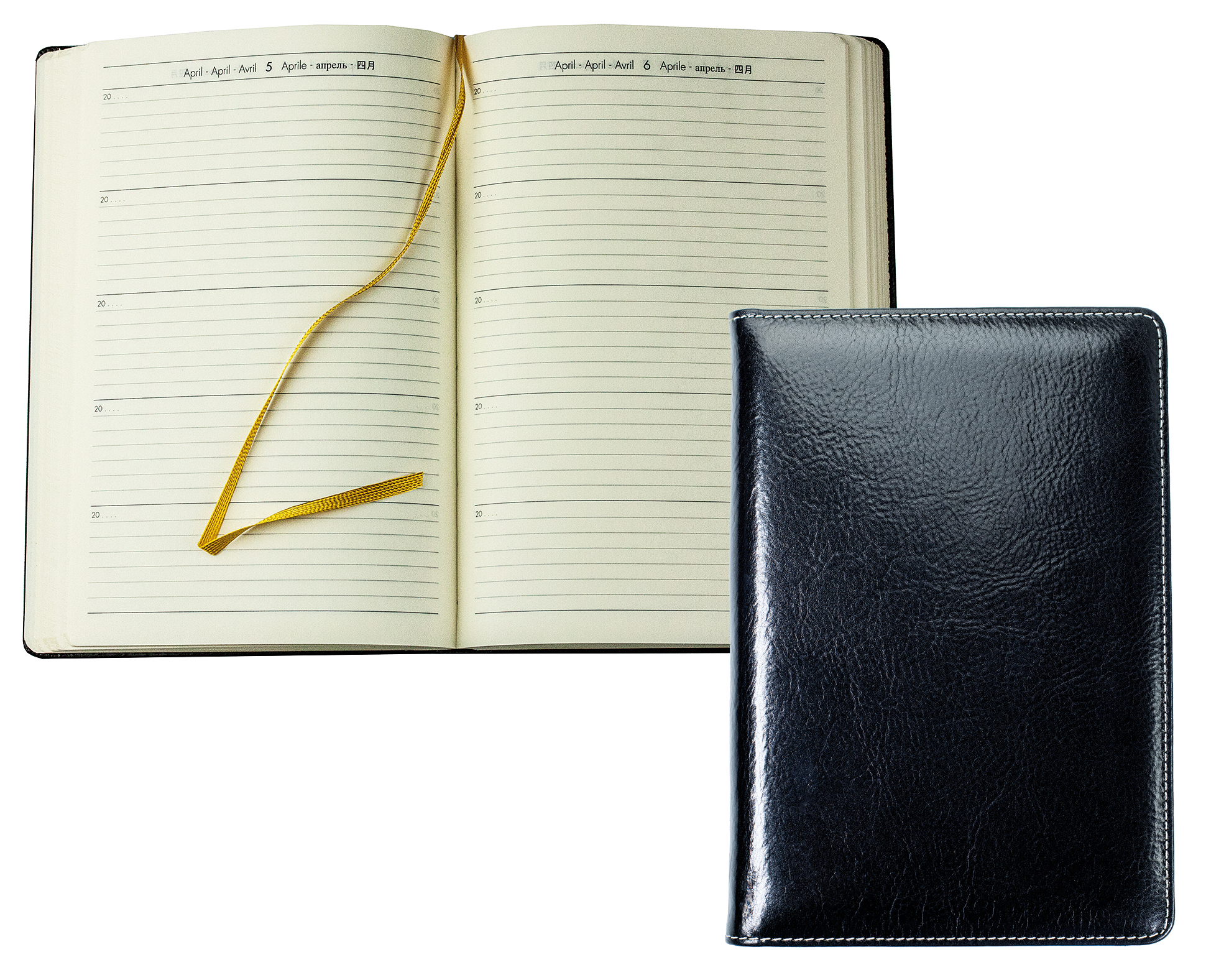 Vergleichender 5 Jahreskalender oder auch Tagebuch für 5 Jahre mit wattiertem Hardcover Einband aus Leder, mit goldfarbenem Merkband und hochwertiger Fadenheftung.