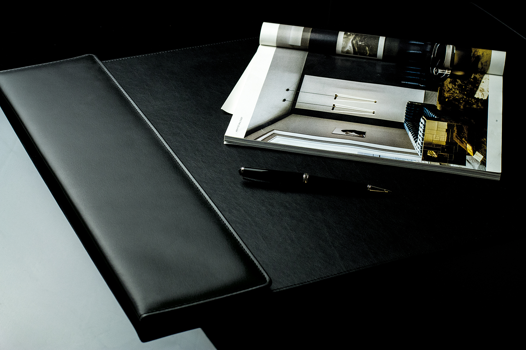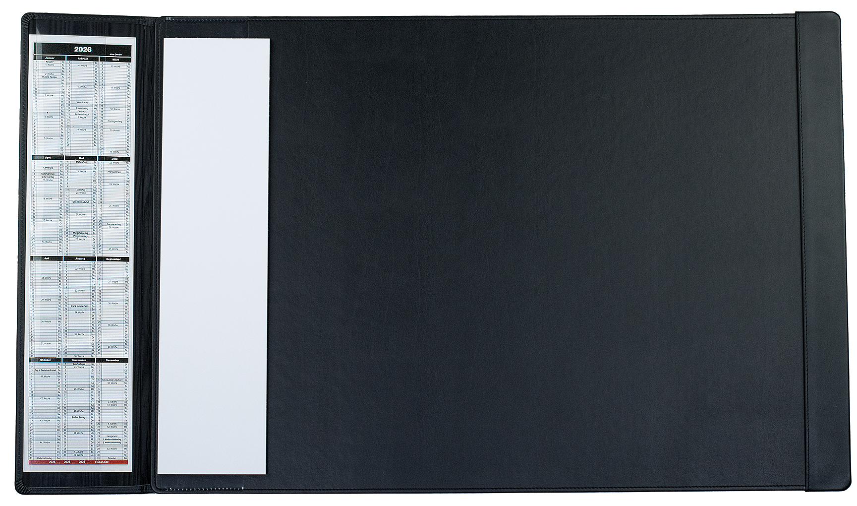 Preview: Schreibunterlage 65x45 mit Klappleiste inkl. Block + Kalender 25/26 PREMIUM LEDER BOXCALF schwarz (glatt)
