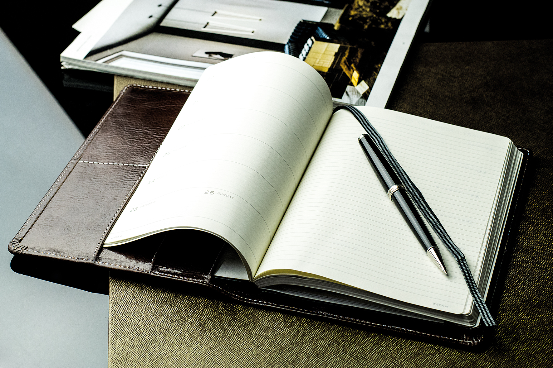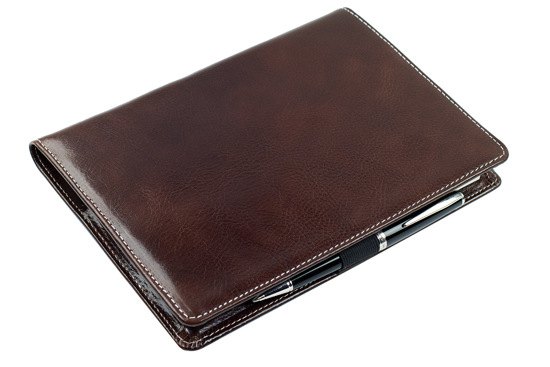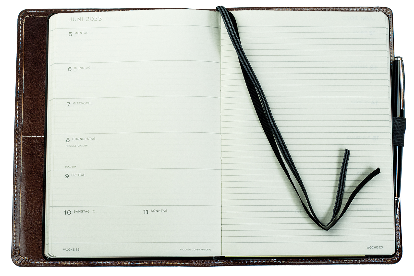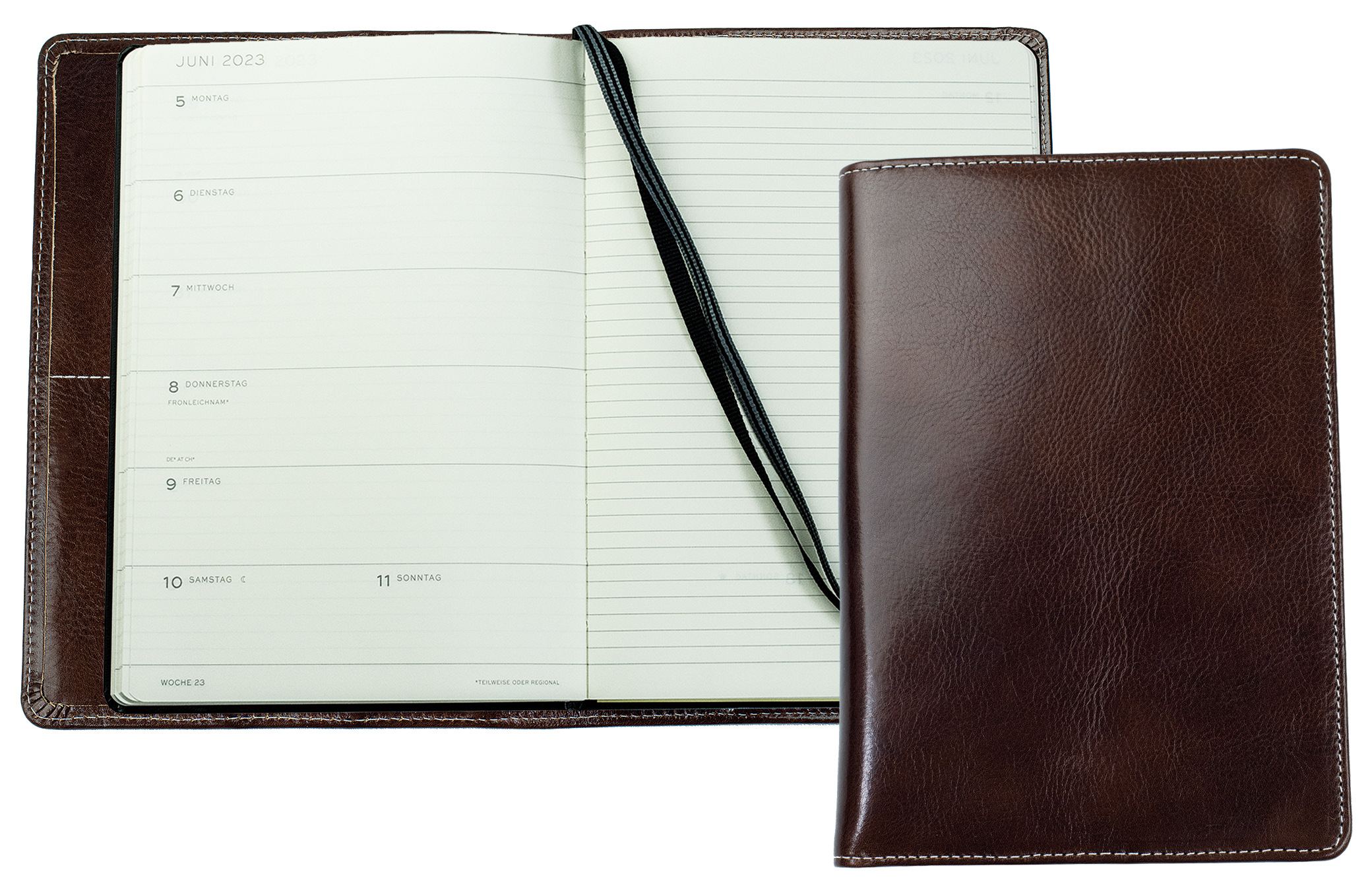 Exclusive Buchhülle aus Leder inclusive Wochenkalender mit Notizbuchfunktion von Leuchtturm1917 mit 2 Merkbändern und schwarzem Hardcocver Einband. Auf der linken Seite befindet sich jeweils eine Woche, auf der rechten Seite dazu entsprechende Notizen. Das Buch hat 144 Seiten Inhalt mit cremefarbenem Papier und Informationen (Feiertage etc.) im Vor- und Nachspann.