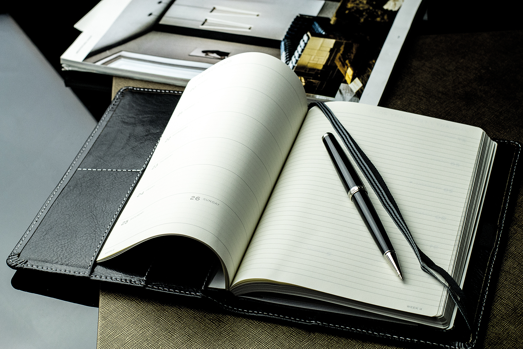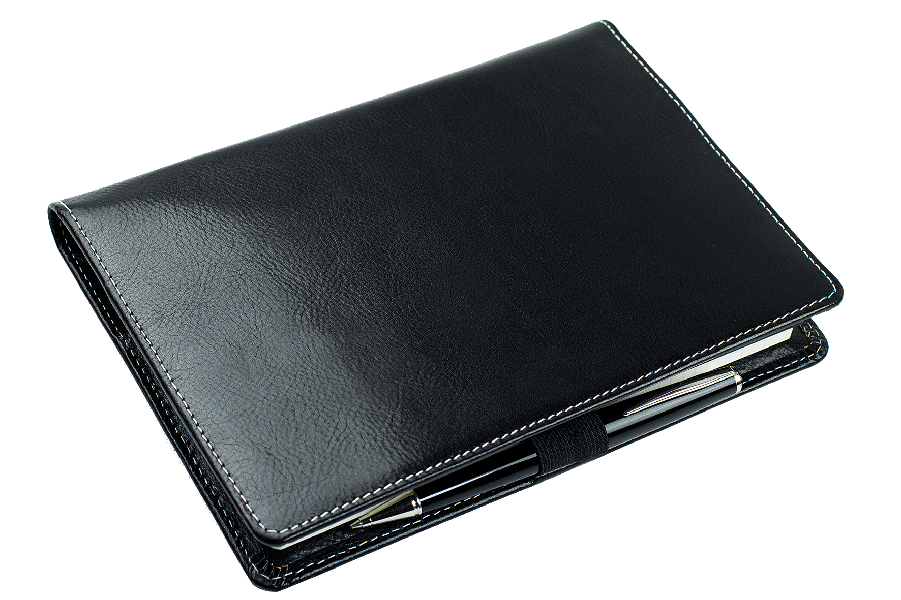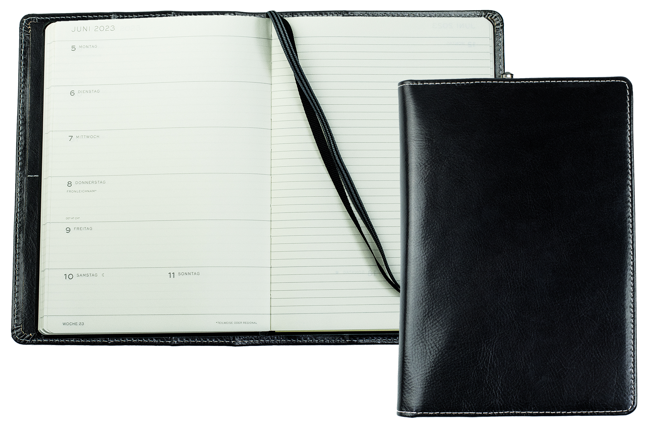 Exclusive Buchhülle aus Leder inclusive Wochenkalender mit Notizbuchfunktion von Leuchtturm1917 mit 2 Merkbändern und schwarzem Hardcocver Einband. Auf der linken Seite befindet sich jeweils eine Woche, auf der rechten Seite dazu entsprechende Notizen. Das Buch hat 144 Seiten Inhalt mit cremefarbenem Papier und Informationen (Feiertage etc.) im Vor- und Nachspann.