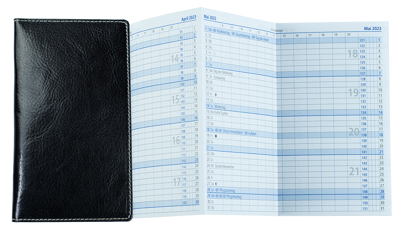 Klassischer Leporello Faltkalender mit einem Monat auf 2 Seiten und separatem Adressenheft. Der Kalender ist 14-fach gefalzt und kann komplett auseinandergefaltet werden. Innen hat der Kalender links und rechts je ein Klarsicht Einsteckfach mit einer Merklasche und 2 Kartenschlitzen. Sie können das Kalendarium jedes Jahr als Ersatzartikel hier im Shop nachbestellen. (Lieferung ohne Schreibgeräte)