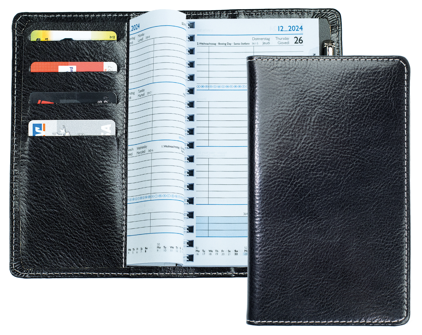 Exclusiver Taschenkalender mit einer Woche auf 2 Seiten. Der Kalender hat 128 Seiten und ist mit einer stabilen Spiralbindung versehen. Das Kalendarium ist 4-sprachig DE-EN-FR-IT und hat Informationsseiten